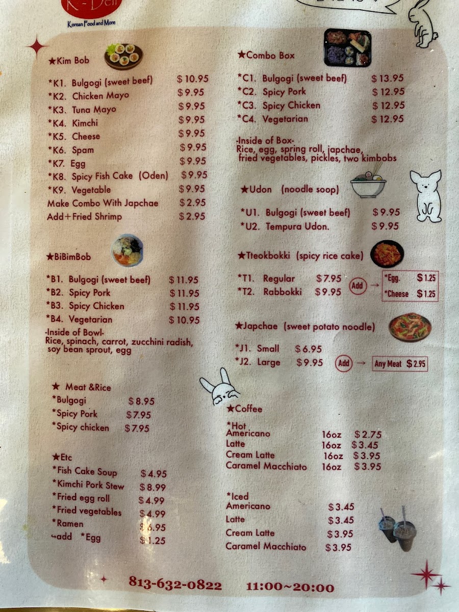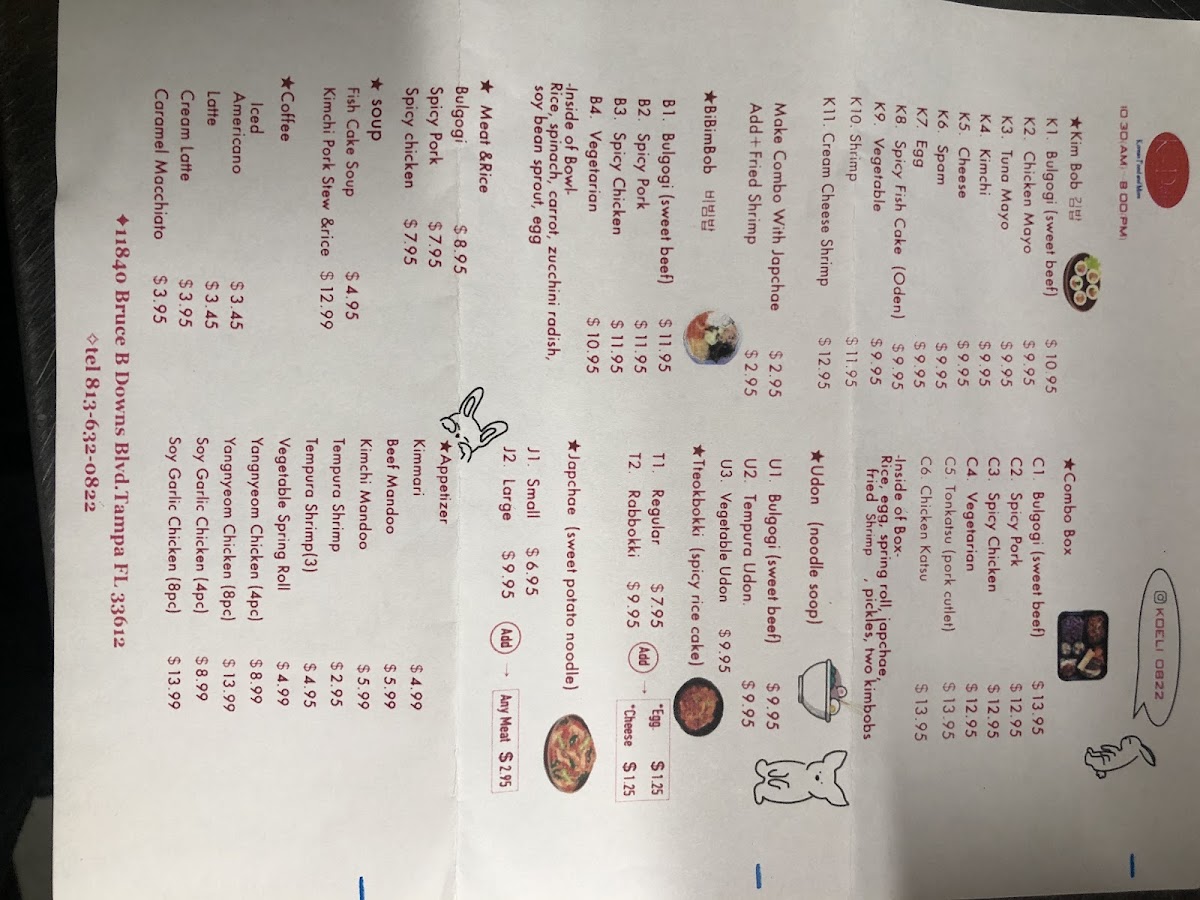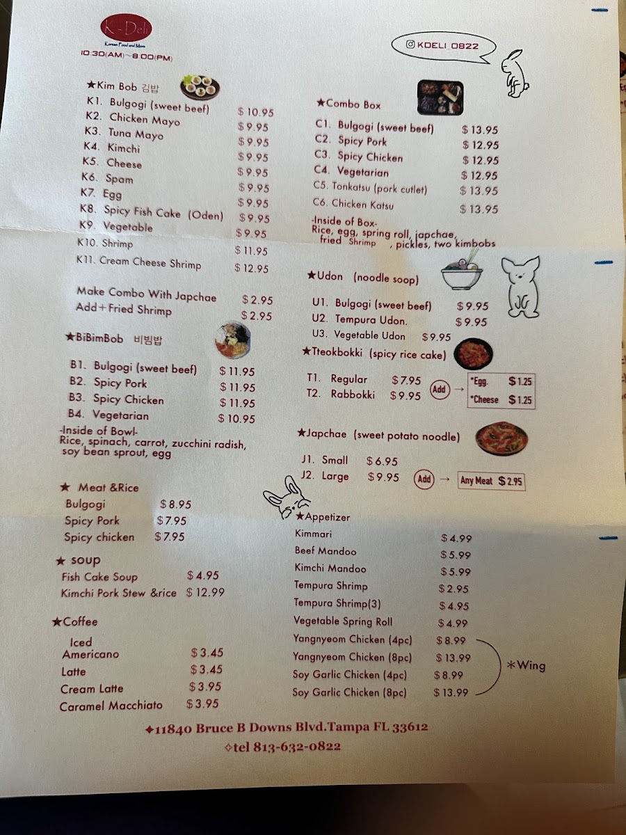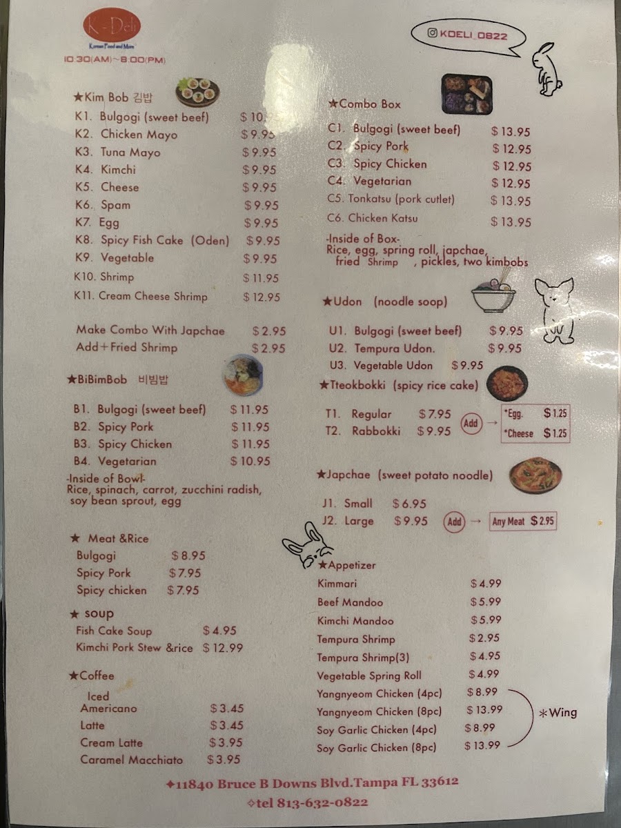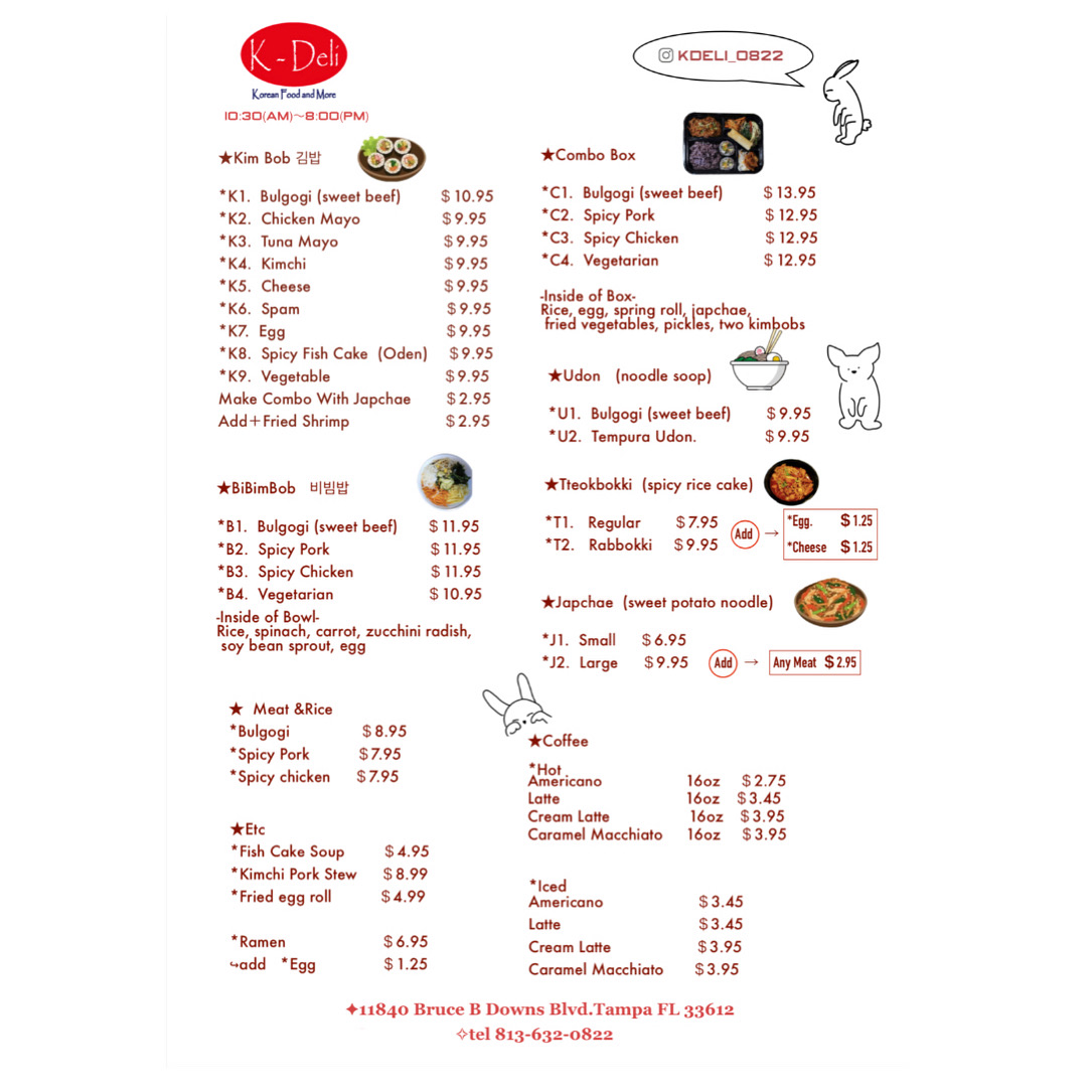 At K-Deli Menu, you'll discover a delightful mix of Korean-inspired dishes that promise to satisfy every craving. Whether you're in the mood for a hearty meal or a light snack, there's something for everyone. Their selection of fresh and flavorful items, like bulgogi sandwiches, savory kimchi fries, and delicious rice bowls, brings the authentic taste of Korea right to the heart of Tampa. The menu is designed with variety in mind, offering comforting classics as well as unique fusion dishes that showcase the best of Korean cuisine. Every bite is crafted with care, using the freshest ingredients to ensure that each dish bursts with flavor. It's the perfect spot for both quick bites and leisurely meals with friends or family. Whether you're a regular or a first-timer, you'll feel right at home at K-Deli.